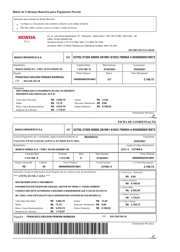 O primeiro exemplo é a quitação do cliente FRANCISCO GEILSON PEREIRA BARBOSA.